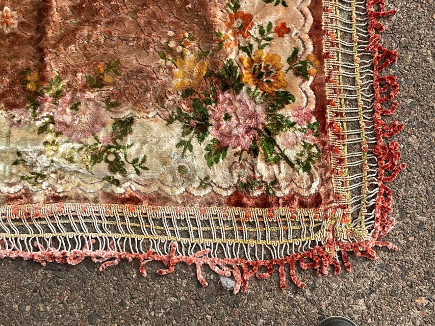 An Italian cut velvet table cover with floral medallion on a café-au-lait field of scrolling foliage, within a floral border and knotted chenille fringe. (54in x 54in)