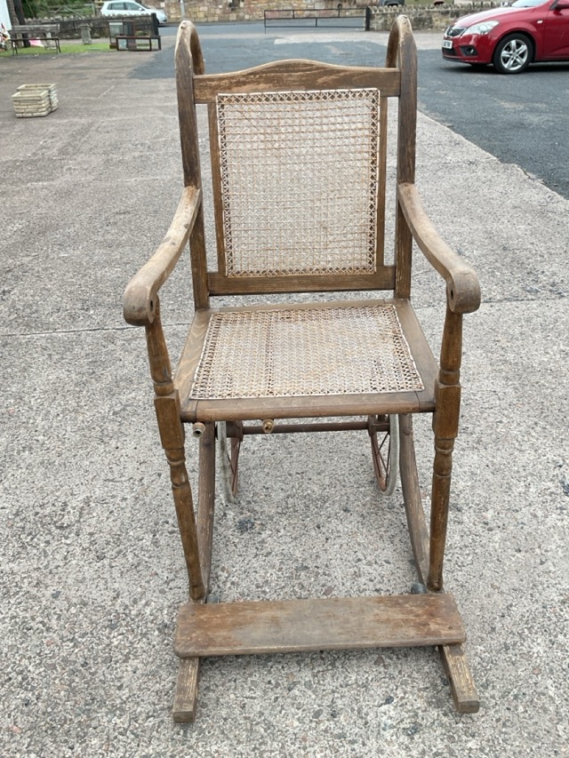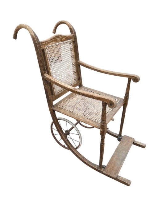 An Edwardian beech wheelchair with caned back & seat supported on spoked wheels, the back with shaped push-along crook handles, the arms on turned supports above a footrest.