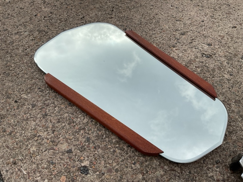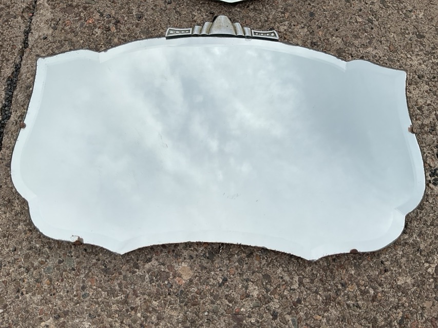 A 60s tapering shield shaped bevelled mirror in mahogany frame - 22.25in; and a shaped 50s frameless bevelled mirror with chrome mount - 27in. (2)