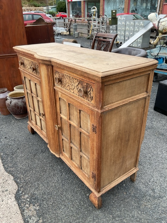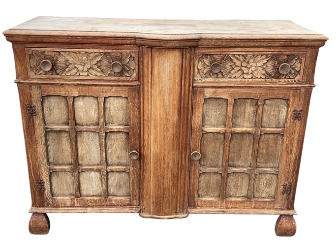 A 50s oak sideboard with bowfronted central panel framed by foliate carved knobbed drawers and chamfered eight panelled doors, raised on shaped spade feet. (50in x 19in x 38in)