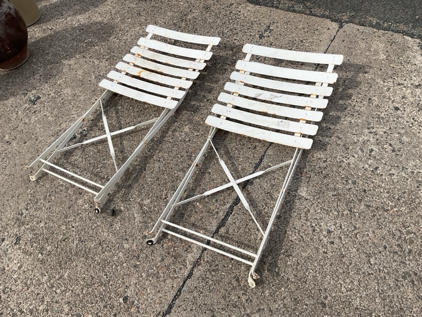 A pair of painted folding metal garden chairs with slatted backs & seats on rectangular folding framed supports with pad feet. (2)