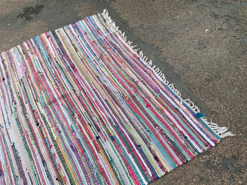 A South African rag rug woven in strung multicoloured bands, having knotted tassled ends. (56.5in x 79in)
