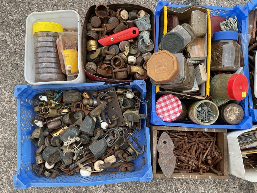 Miscellaneous materials - cabinet handles, nails, screws, galvanised clouts, brass upholstery studs, door furniture, knobs, pins, castors, brass, drills, staples, etc. (A lot)
