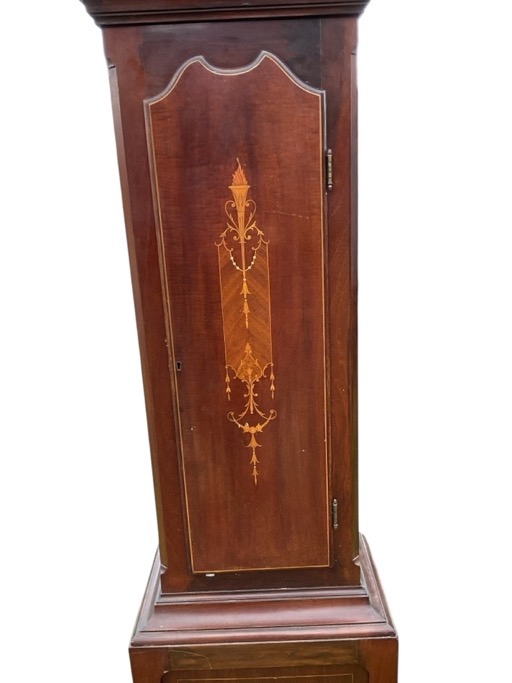 A nineteenth century mahogany loncase clock, the case with swagged harebell inlay to hood & panelled base having marquetry decorated hinged trunk door, the westminster chime movement by James Walker Ltd of London with brass dial and silvered roman chaper ring. (81.75in)