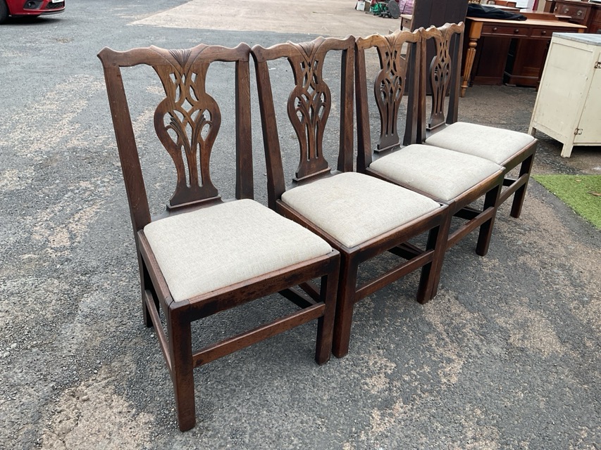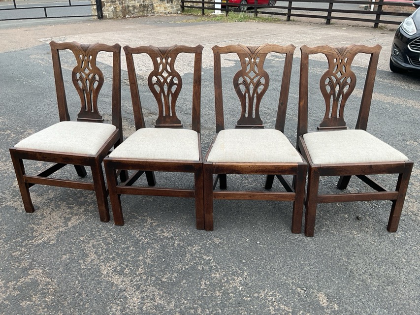 A set of four eighteenth century laburnum Chippendale style chairs with shaped carved pierced splats beneath shell carved rails, above drop-in newly reupholstered Ralph Lauren linen seats, raised on square chamfered legs joined by stretchers. (4)