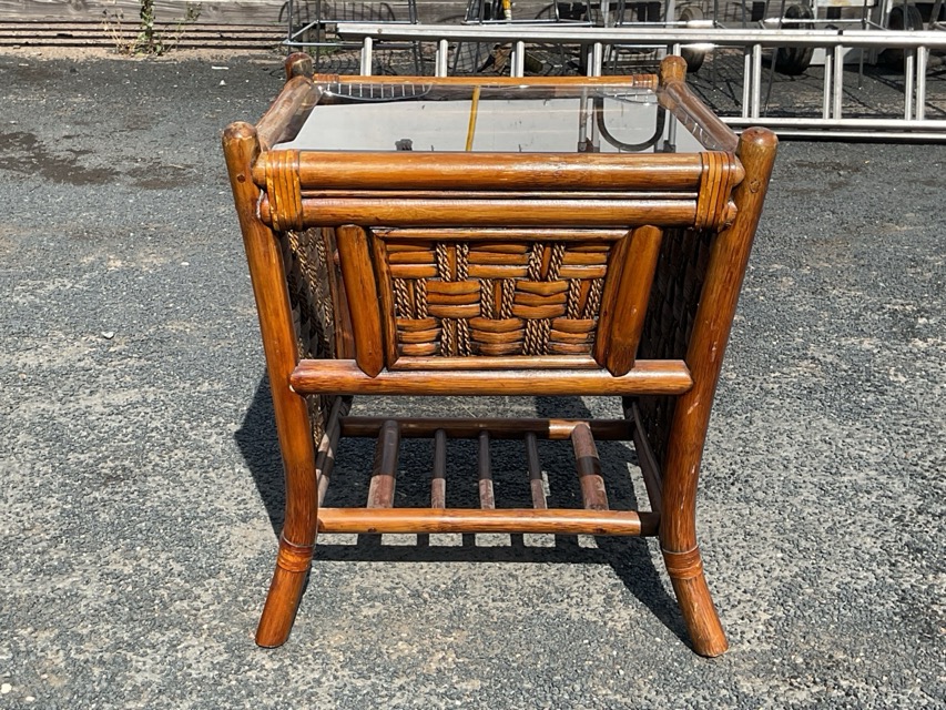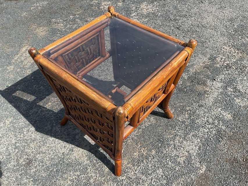 A cane coffee table with square bevelled glass top above woven cane and seagrass panels on splayed cylindrical legs joined by a slatted undershelf. (21in x 21in x 23.5in)