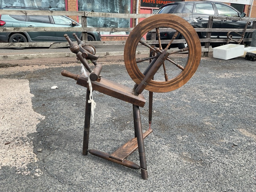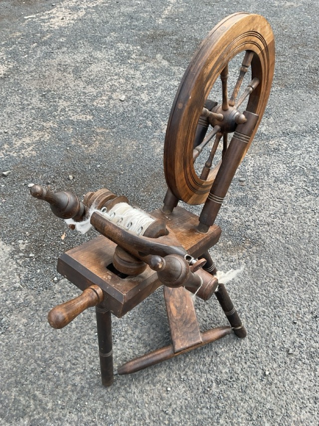 A beech Saxony style spinning wheel with angled platform supporting spindled wheel and bobbin mounts, with treadle mechanism below. (29in x 16in x 32in)
