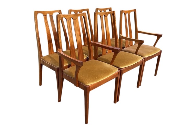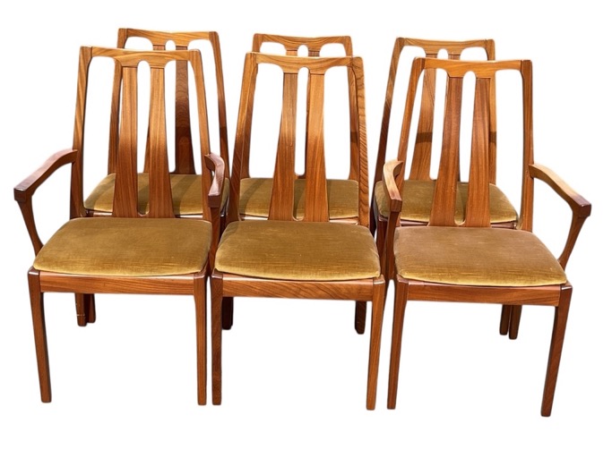 A set of six Nathan teak dining chairs including two carvers with tapering slatted backs above upholstered seats raised on tapering square legs, the carvers with curved arms on conforming supports. (6)