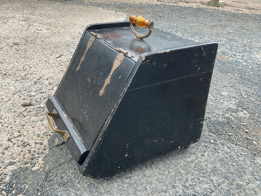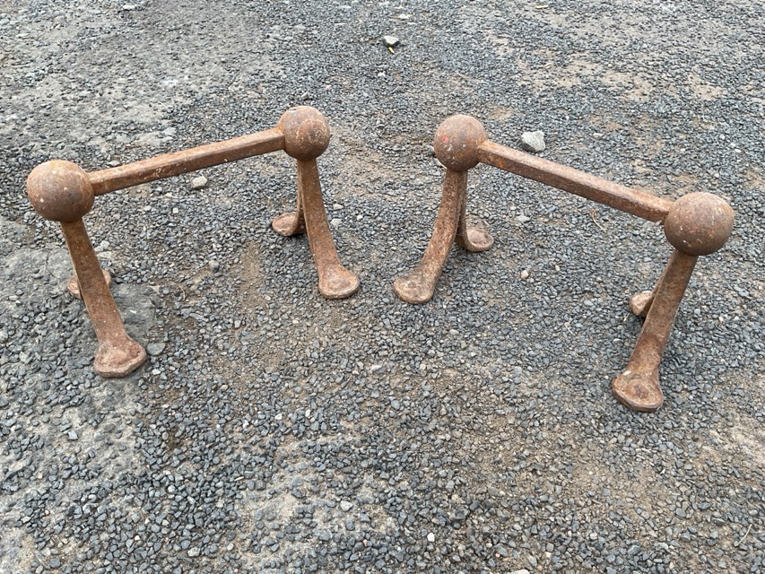 An Edwardian painted coal box with amber glass brass handle, the slope front with strap hinges; and a pair of Edwardian art nouveau fire dogs with stylised splayed foliate feet and ball finials. (3)