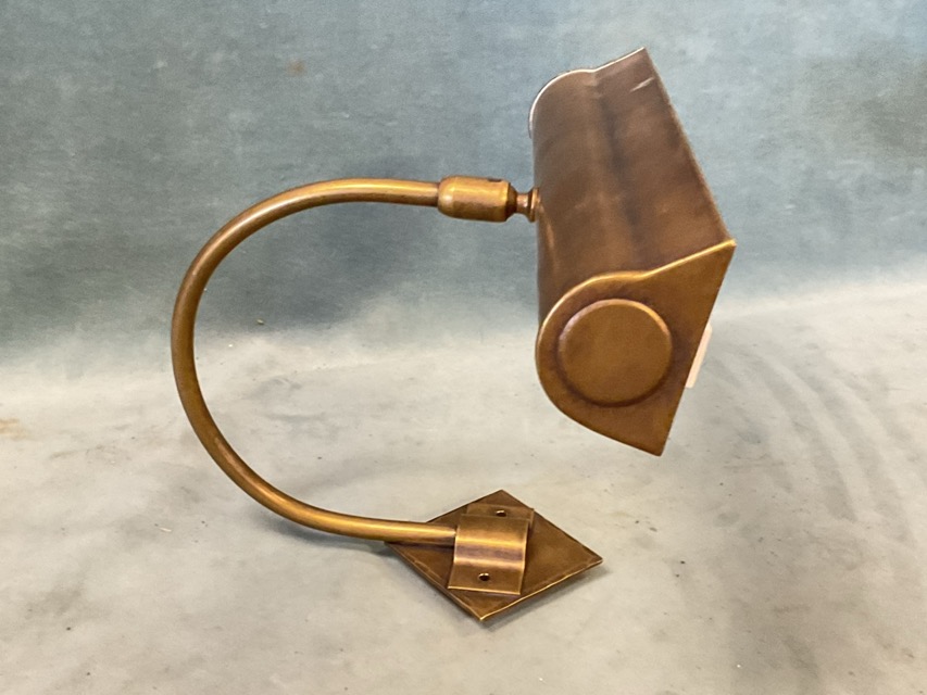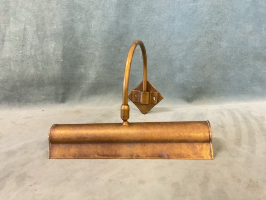 A Jim Lawrence brass picture light with square wall-plate and arched bracket supporting rectangular hooded shade. (12in)