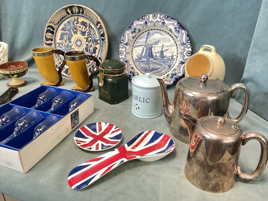 Miscellaneous ceramics & glass - a pair of Shelley tankards, a Spanish handpainted blue & white dish, a Delft plate, a silver plated teapot and jug, a boxed set of six sherry glasses, a salt pig, storage jars, spoon rests, a cachepot, etc. (A lot)