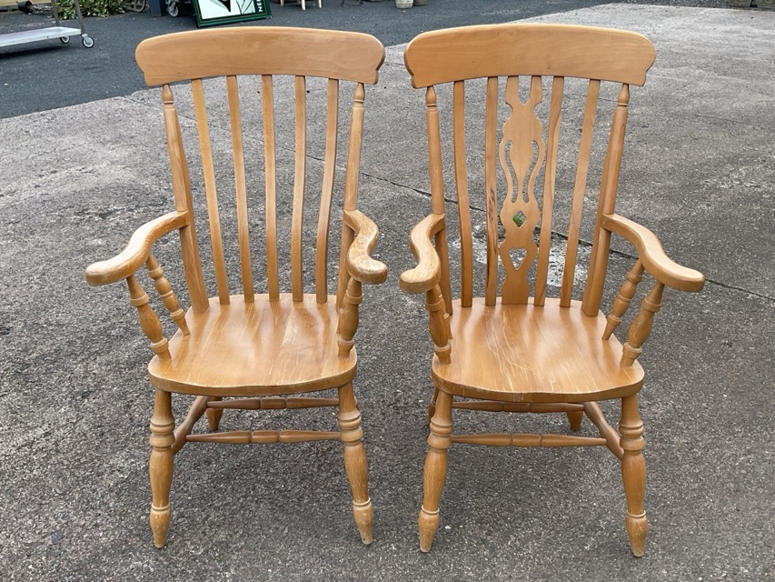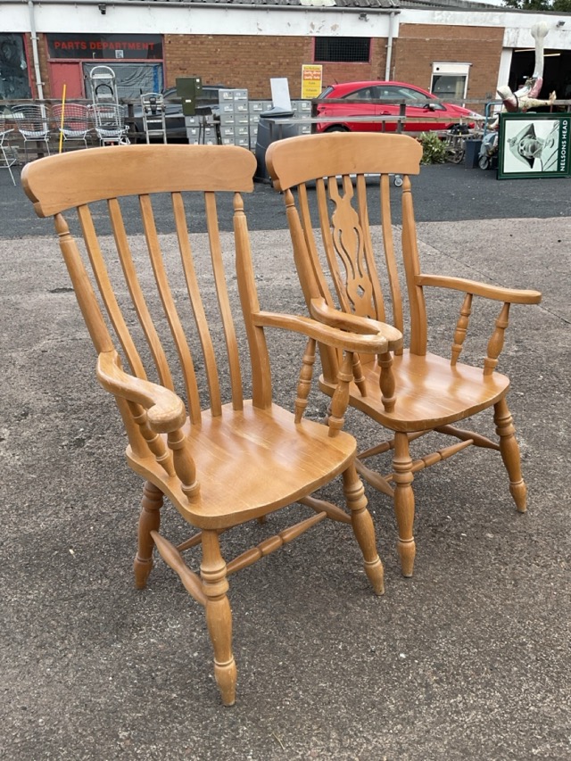 A Victorian style beech farmhouse armchair with curved back and pierced splat flanked by slats above a solid seat framed by serpentine shaped arms on spindle supports, raised on turned legs; and another similar with slatted back. (2)