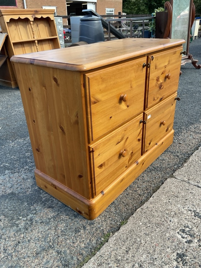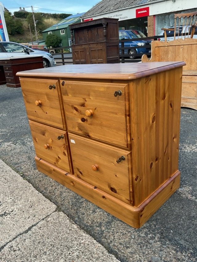 A Victorian style pine filing cabinet with moulded rectangular top above four knobbed file drawers (with keys) raised on a rounded plinth. (39in x 17.5in x 29.5in)