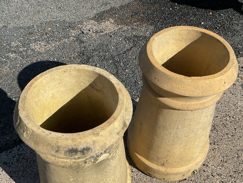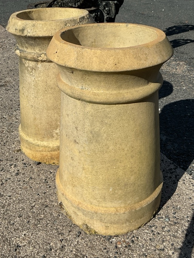 A pair of tapering stoneware chimney pots with chamfered rims above tubular collars, the bases with plinths. (18.5in) (2)
