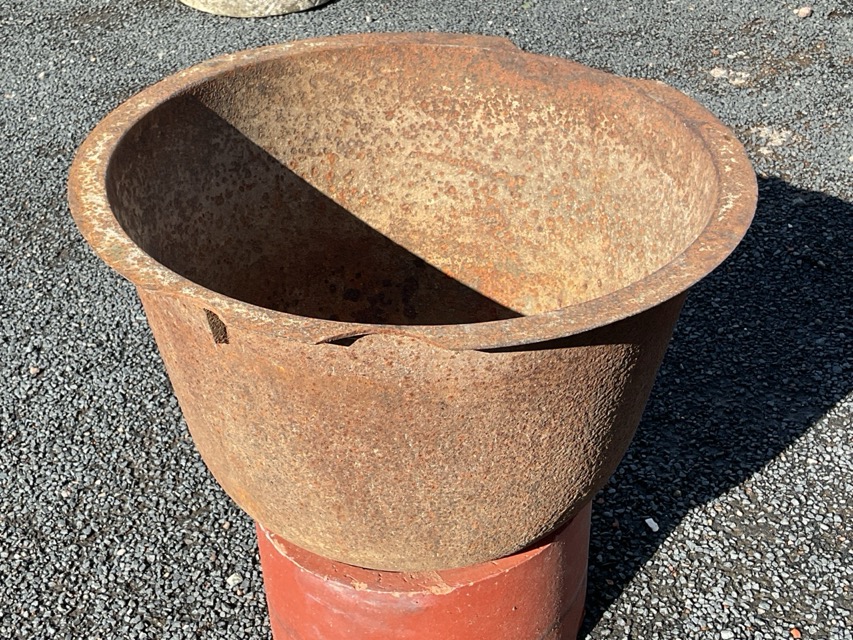 A cast iron urn or boiling/cooking pot with flat rim, supported on an associated terracotta pipe stand. (17.5in x 15.75in) (A/F)