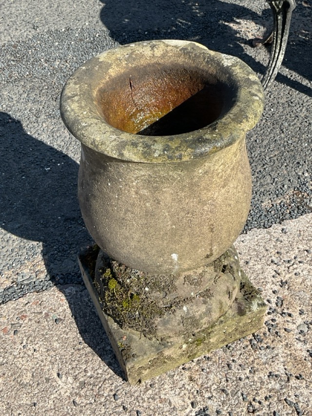 A C19th sandstone garden urn, the tall bulbous vessel on circular base above square plinth. (16.75in)