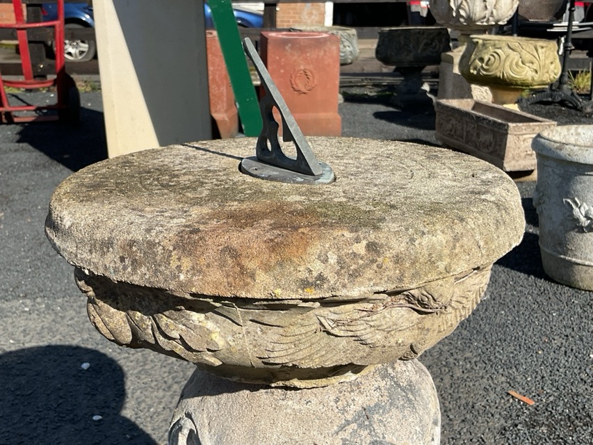 A composition stone garden sundial with bronze gnomon on circular hand-cut panel, the associated support with leaf cast decoration to waisted column. (24in)