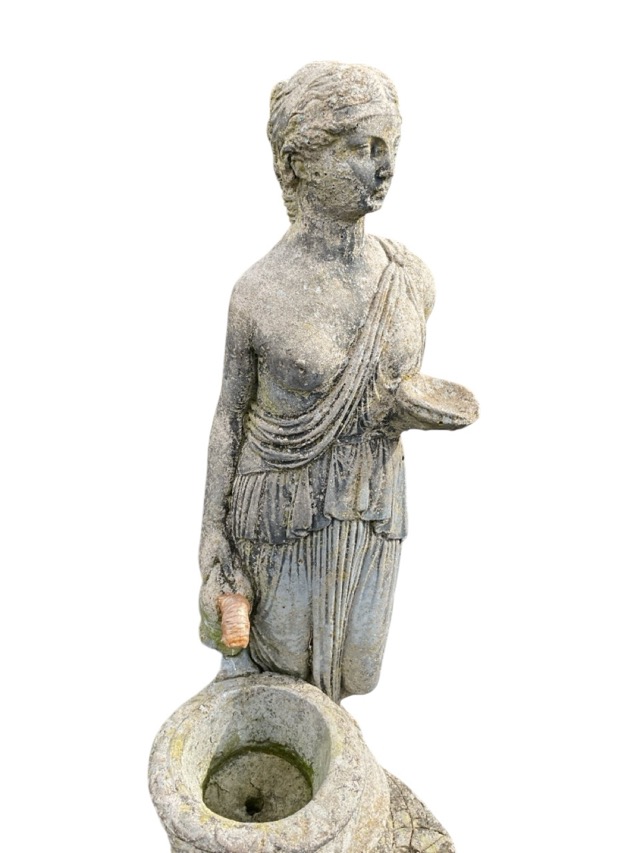 A composition stone garden sculpture with classical draped lady beside an urn above a pool, mounted on an associate rocky cast support- piped for water. (41.75in)