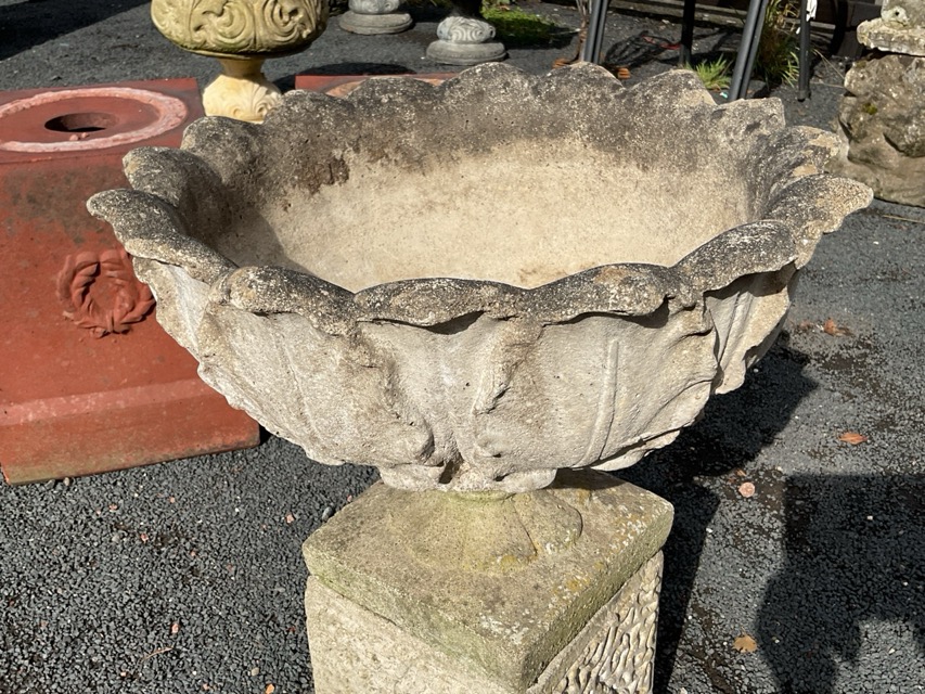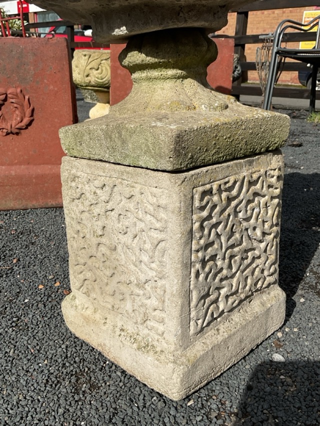 A composition stone garden urn on an associated stand, the leaf moulded pot on fluted socle with square plinth, the base with seaweed type moulded panels. (19in x 25.5in)