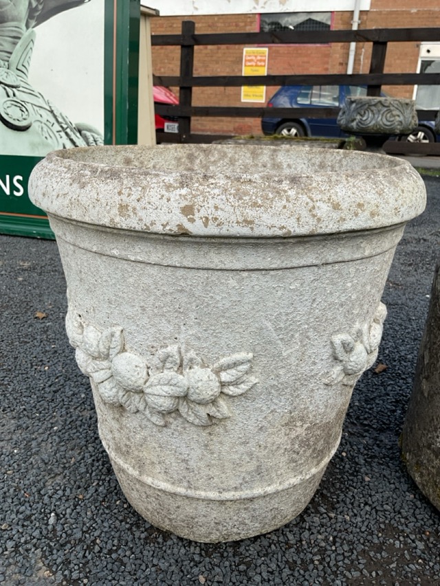 A painted composition garden pot of tapering bucket shape, embossed with fruit & leaves; and a plain tubular garden tub. (14in & 12.5in) (2)