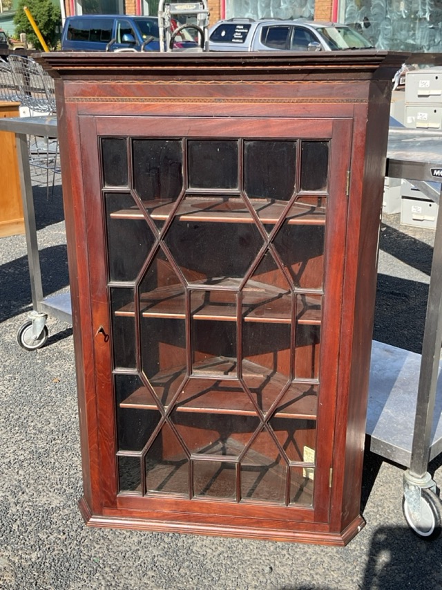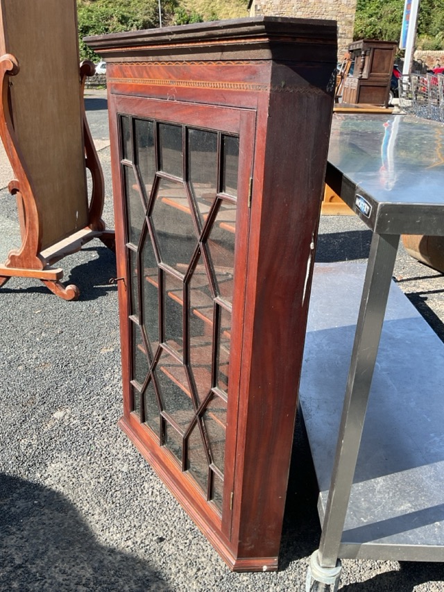 A C19th Georgian mahogany hanging corner cabinet with moulded inlaid cornice above a geometric marquetry banded frieze and astragal glazed door enclosing shelves. (29in x 17in x 43.5in)
