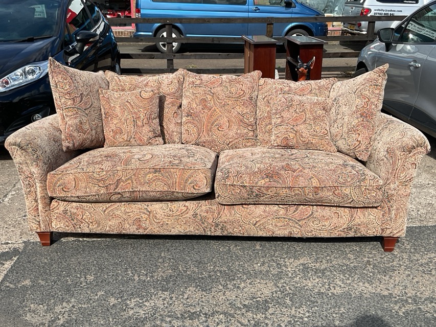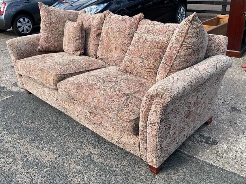 A Parker Knoll three-seater sofa with rectangular back and seat with loose cushions flanked by outscrolled arms covered in paisley chenille fabric, raised on tapering square feet. (88in)