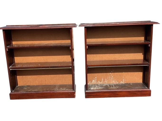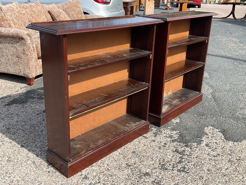 A pair of mahogany bookcases with rectangular moulded tops above open adjustable shelves on moulded plinths. (38in x 11.75in x 37.5in) (2)