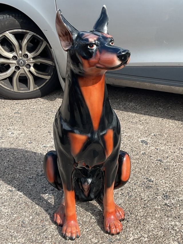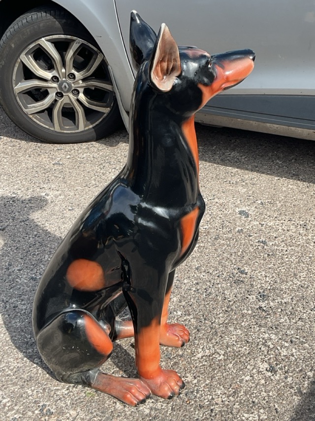 A life-sized ceramic figure of a seated Doberman Pinscher dog with alert expression. (33in)