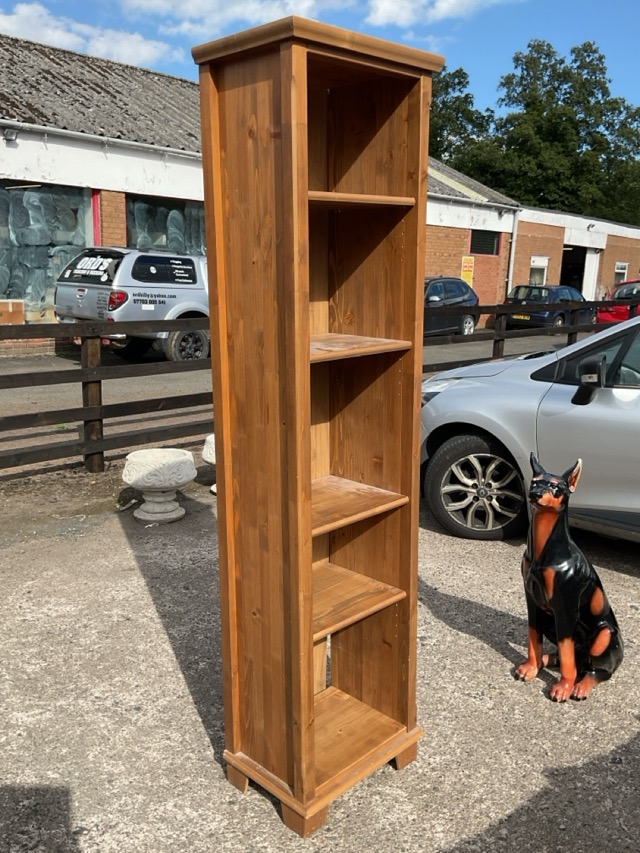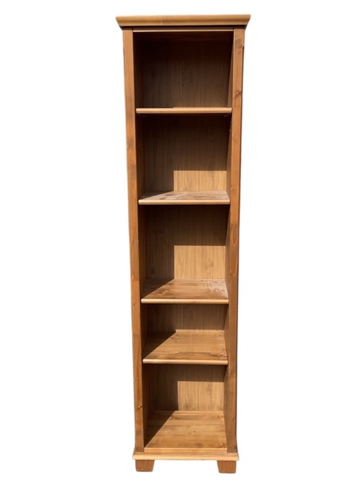 A pine bookcase with moulded cornice above five adjustable shelves, on a moulded base raised on square block feet. (19.5in x 13.5in x 76in)