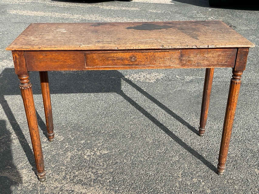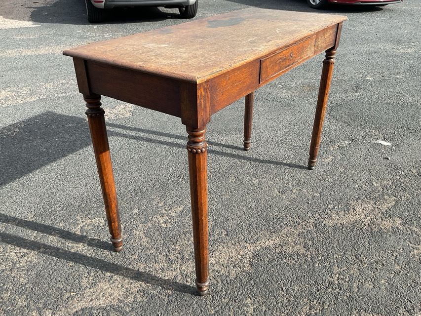 A Victorian oak side table with rectangular top above a plain frieze with cockbeaded drawer, raised on turned tapering polygonal legs with beaded collars. (45in x 19.5in x 30.5in)