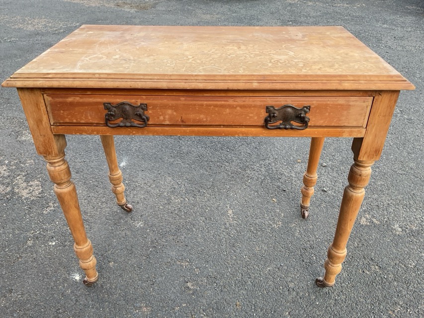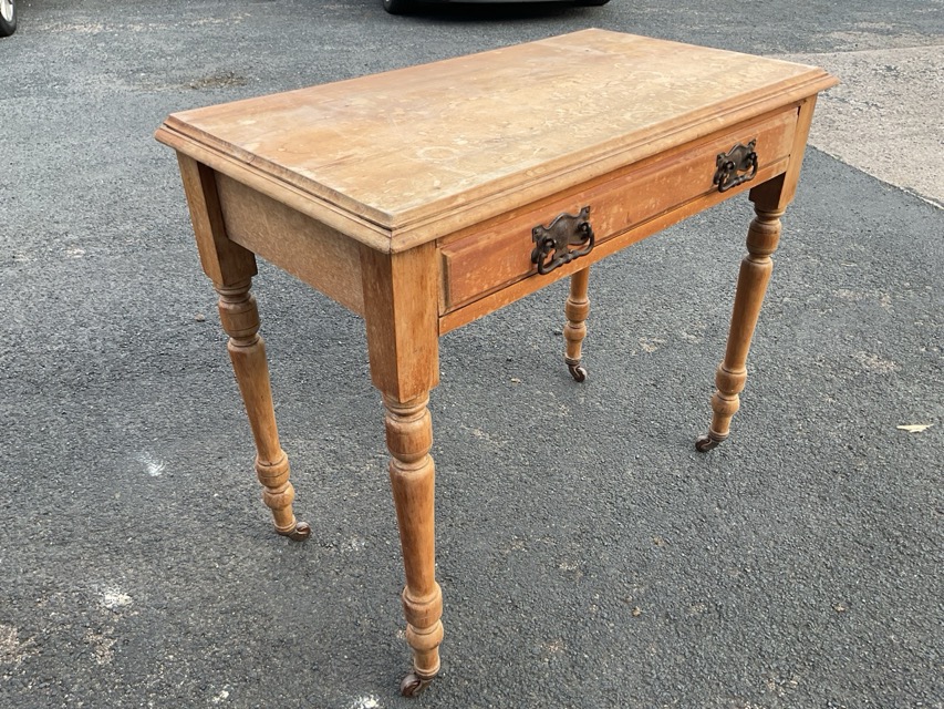 A Victorian hardwood side table with moulded rectangular top above a frieze drawer, raised on turned tapering legs with ceramic castors. (33in x 18in x 28.5in)