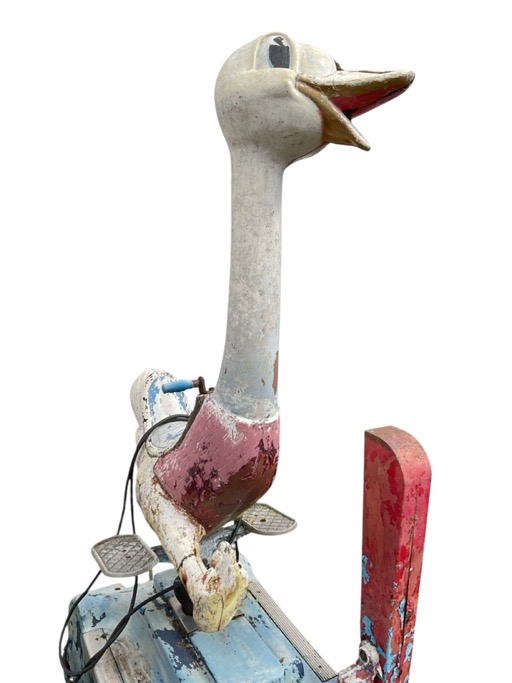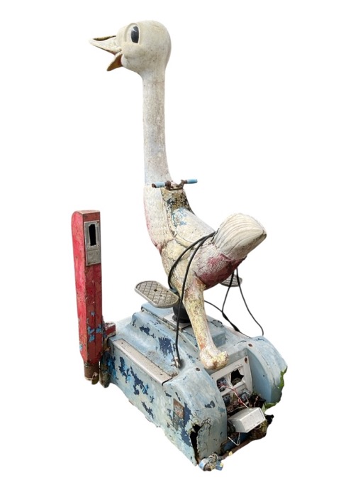 A lifesize mechanical ostrich fairground penny ride, the seat with handle and foot rests, raised on tiered plinth having money slot to column. (A/F) (28in x 39.5in x 72in)