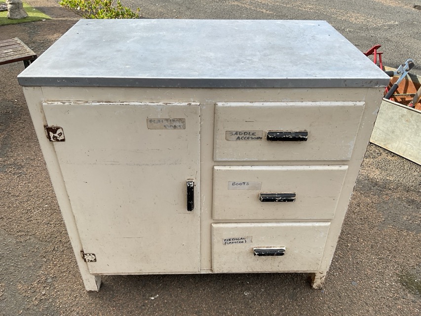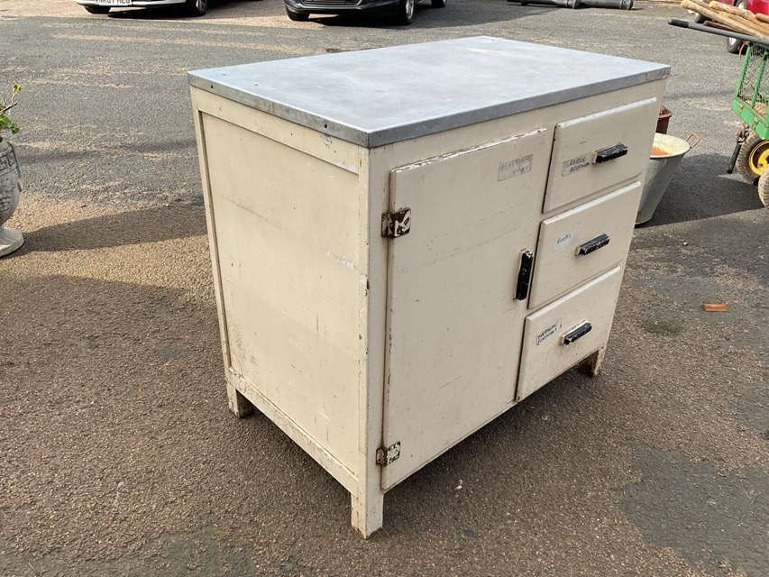 A C20th kitchen cabinet, the rectangular aluminium top above cupboard and three drawers, raised on square legs. (33.25in x 21in x 31.25in)
