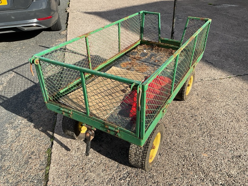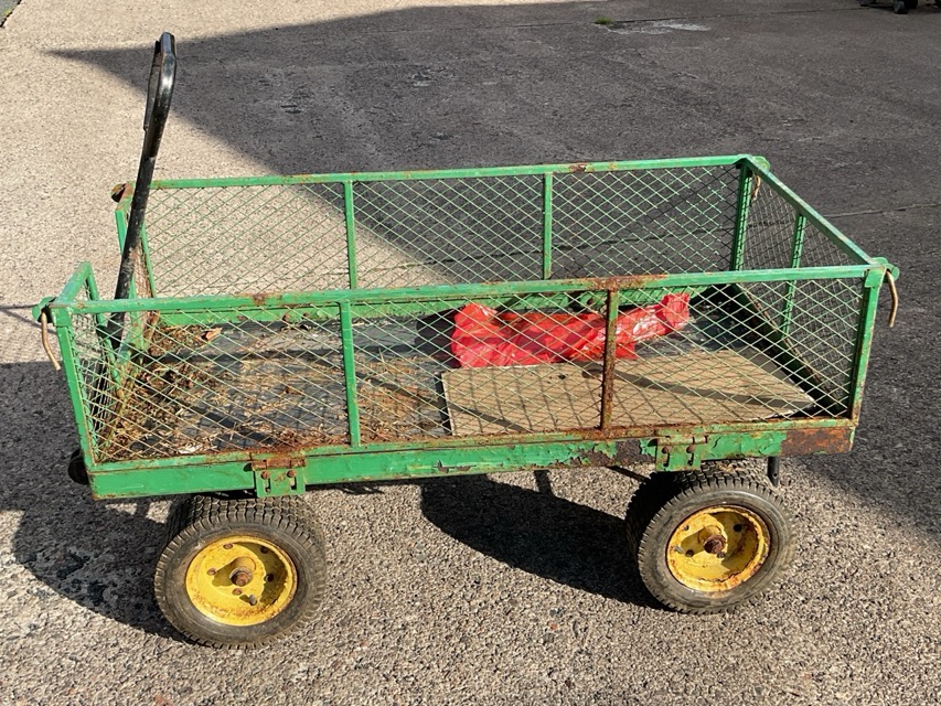 A rectangular garden trolley with caged sides, raised on pneumatic wheels with tubular push/pull handle. (55in)