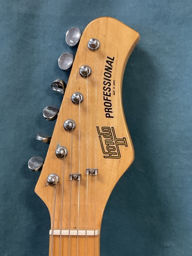 A cased Hondo II electric guitar with waisted cedar body, black guard, brass frets, angled headstock, etc - as new. (39in)