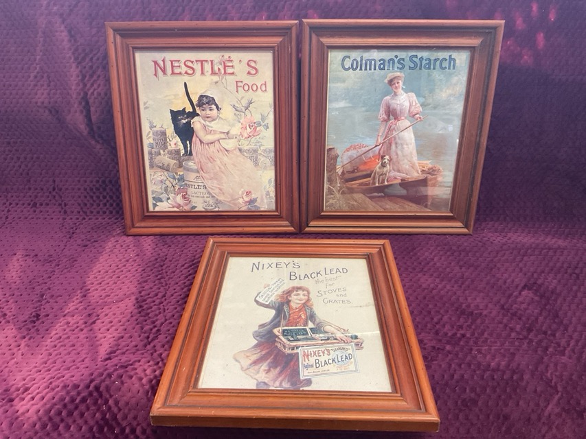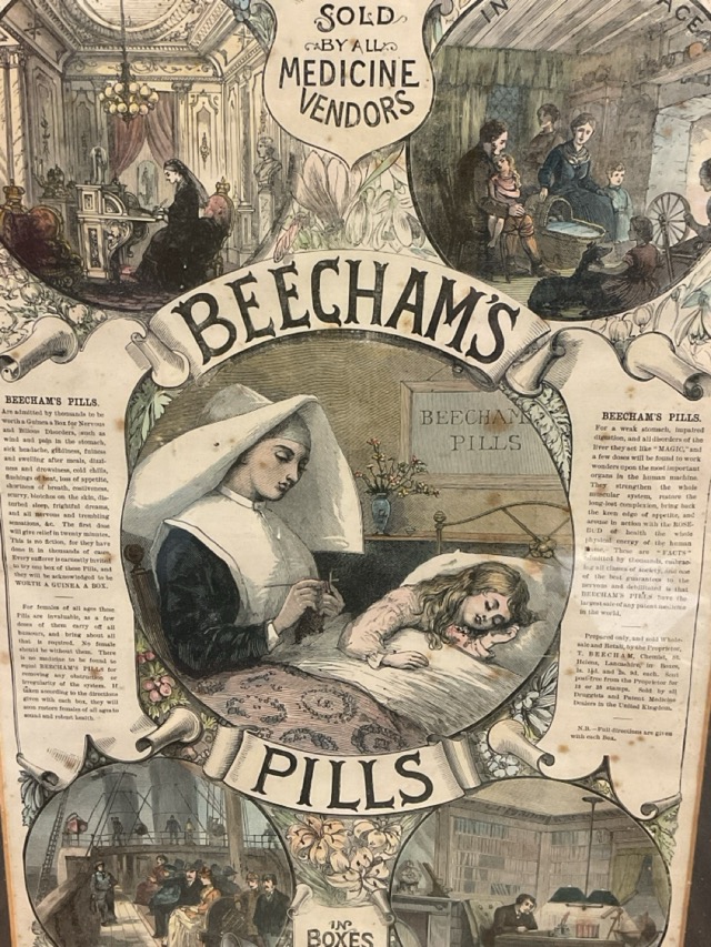 A Victorian gilt framed advertisement for Beecham Pills dated 1888; and a set of three pine framed reproduction advertising posters - Nestle Food, Colemans Starch & Nixeys Black Lead. (4)