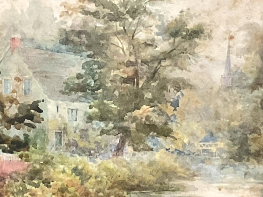 Victorian watercolour, riverscape with cottage and distant footbridge and church spire, unsigned in a period gilt slip and frame. (14.5in x 10in)