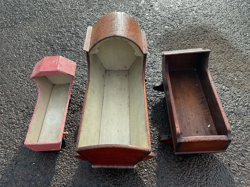 A Victorian pine cradle with scumbled decoration; another antique dolls cradle with domed canopy; and a smaller painted example. (3)