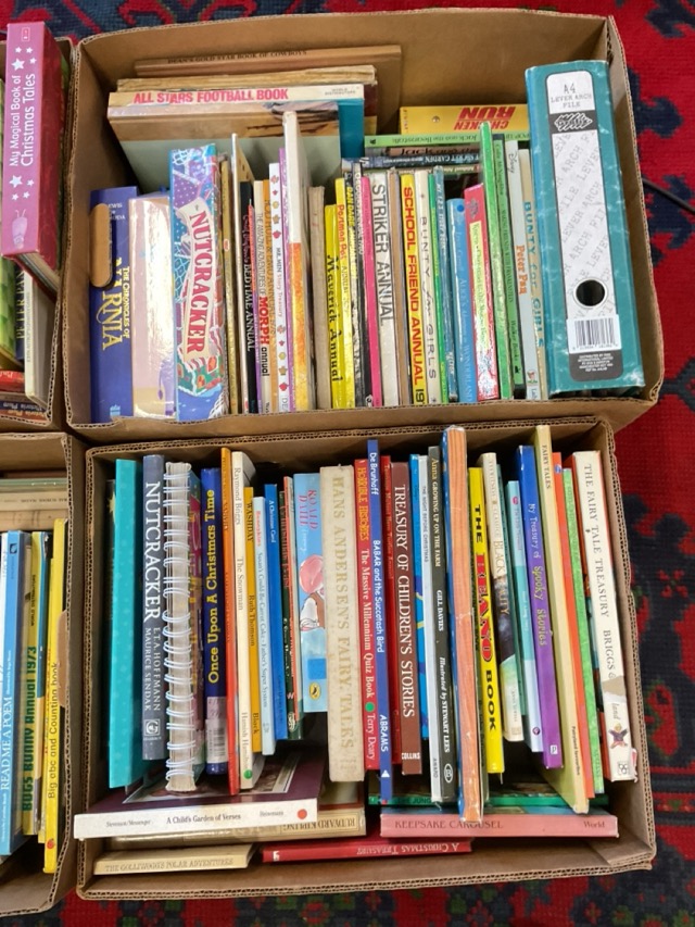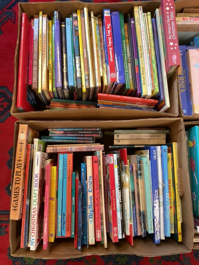Four boxes of childrens books - mainly contemporary, annuals, fairy tales, classic stories, Roald Dahl, Christmas, cartoons, a file of comics - Beano, Dandy, etc, westerns, pop-up books, games, magic, ladybirds, etc. (over 200)