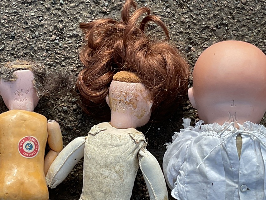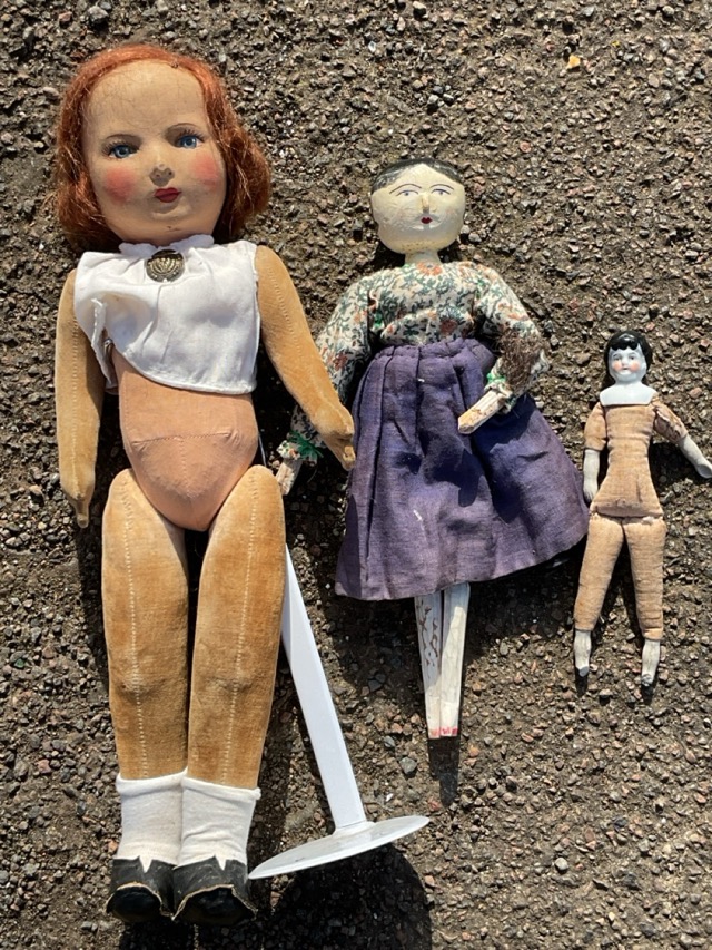 Four porcelain head dolls, a miniature with cloth body, SFBJ - Paris with sleeping eyes and articulated composition body, Theodor Recknagel with jointed kid body, a 20s Herman Steiner baby doll with sleeping eyes, a 30s Norah Wellings cloth doll, and a peg-jointed painted wood doll. (6)