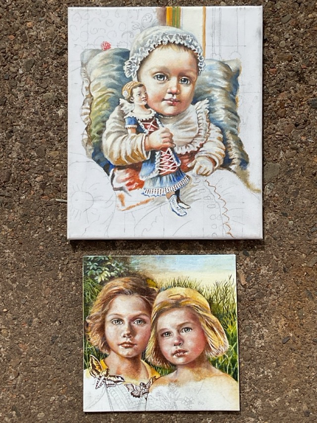 Manuella Norris, oil on canvas, a girl and her dolls watching a puppet show, titled Last Show Before Bedtime; an oil on board depicting a Victorian baby with a doll; and another with two girls in countryside with moths, unsigned. (3)