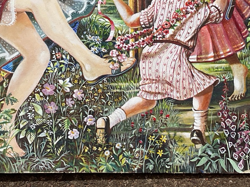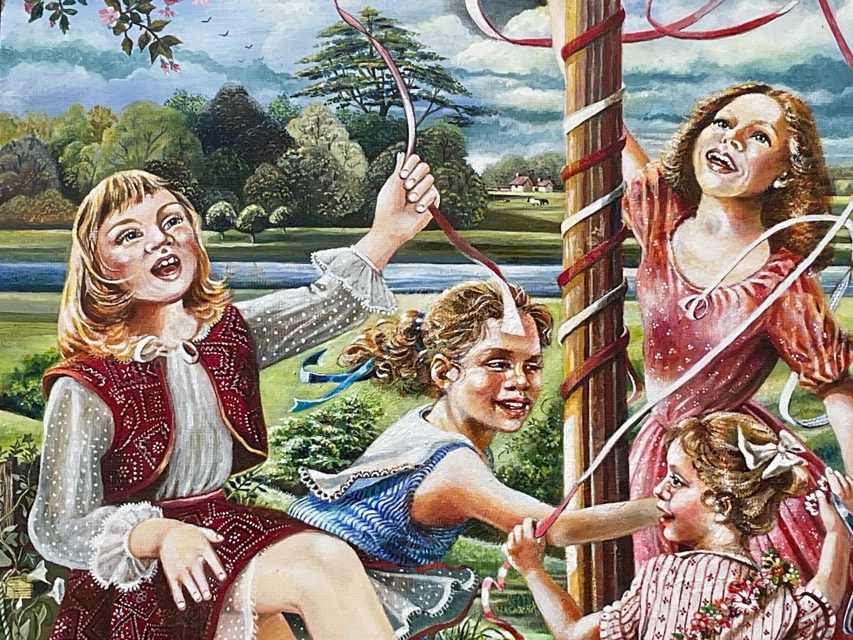 Manuella Norris, oil on board, four girls dancing around a maypole amid wildflowers in a landscape, unsigned. (20in x 30in)