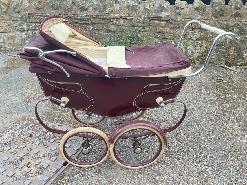 A Silver Cross burgundy coloured pram retailed by A Taylor & Co, having canvas canopy & embellished opening, with padded upholstered interior. (36in)