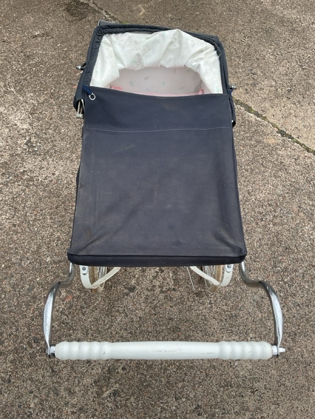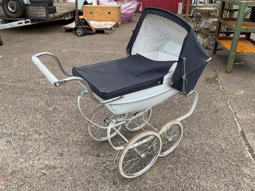 A Silver Cross childs pram, the enamelled body with shaped handle having concertina hard cover, raised on sprung supports with chromed spoked wheels.
