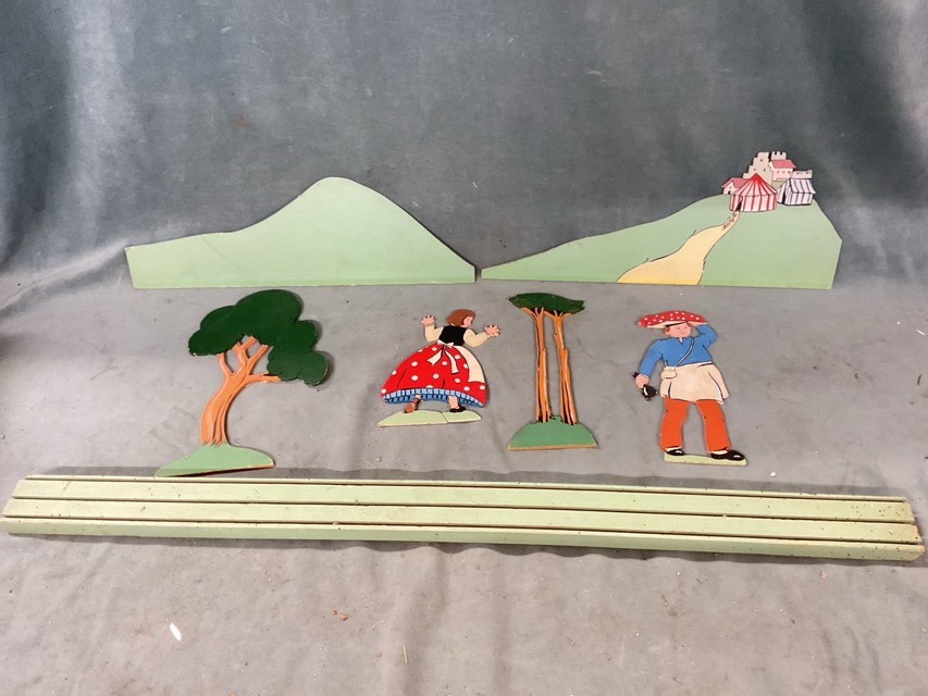 A set of beech architectural building blocks with turned baluster columns, arches, beams, cubes, etc; and a German handpainted cutout nursery diorama of hills with a town and circus, trees, a girl and a baker boy. (2)