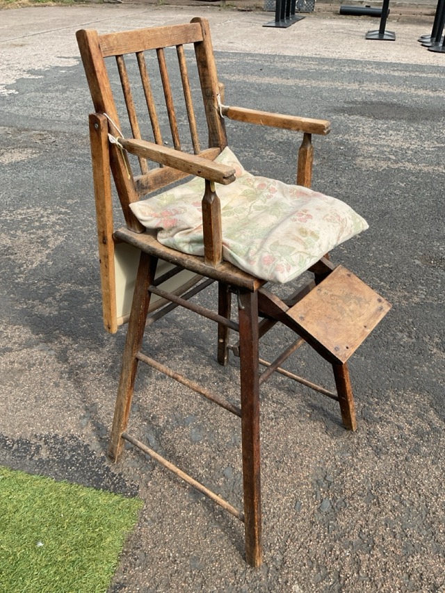 A 40s elm high chair with rectangular spindle back, solid seat, hinged tray and rectangular footrest, raised on splayed square legs joined by stretchers. (14.5in x 20in x 39in)