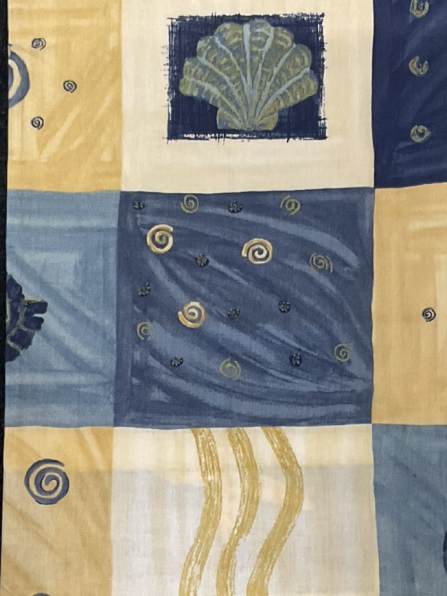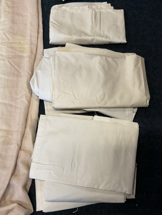 A pair of lined cotton curtains printed with squares of seaside motifs - 63in drop x 48in hem; a single raw cotton curtain with 91in drop; and a quantity of thermal and plain cotton curtain linings waterproofed cotton shower curtains and plain cotton fabrics. (A lot)