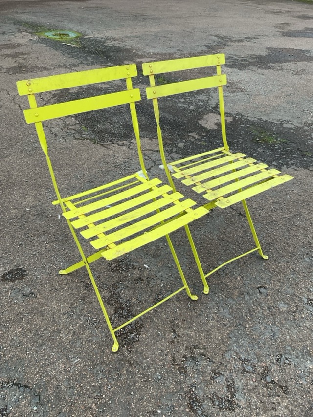 A pair of folding painted metal garden chairs with slatted backs & seats on rectangular legs with pad feet. (2)