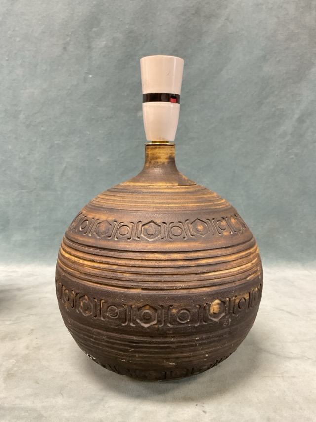 A studio pottery stoneware tablelamp by John Davey - Bridge of Dee, with stylised plant decoration; and a spherical thrown pottery lamp with ribiing and impressed geometric motifs. (12in) (2)
