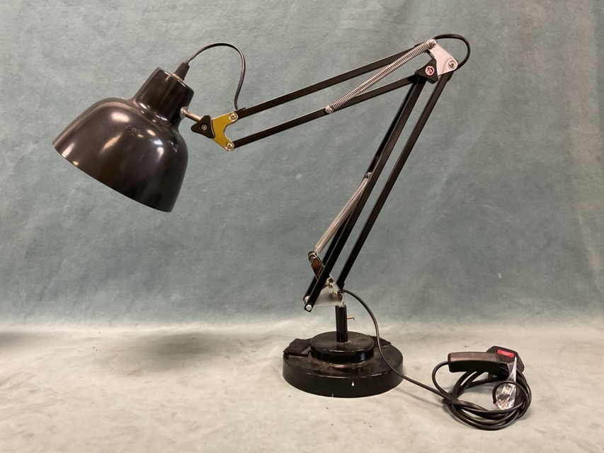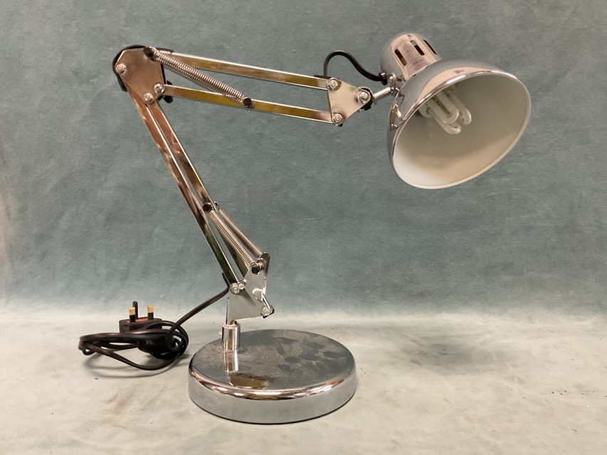 A chromed anglepoise style adjustable desk lamp with domed metal shade rotating on a weighted circular base; and another larger in black with bell shaped shade rotating on a circular stepped weighted base. (2)